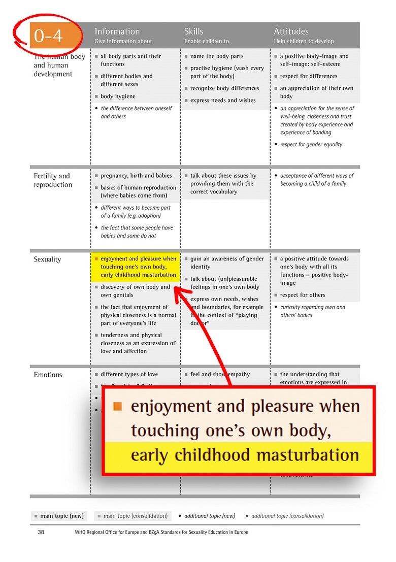 Auf Seite 71 werden Pädagogen angewiesen, kleinen Kindern ab 5 Jahren das Küssen, Umarmen, Berühren und sexuelles Verhalten beizubringen. Neunjährigen soll über Masturbation, sexuelle Anziehung und sexuelle Stimulation beigebracht werden. Die Vereinten Nationen haben beschlossen, dass kleinen Kindern in Grundschulen Masturbation, Sexualverhalten, sexuelle Anziehung und sexuelle Stimulation beigebracht werden müssen, damit sie einen Sexualpartner haben.