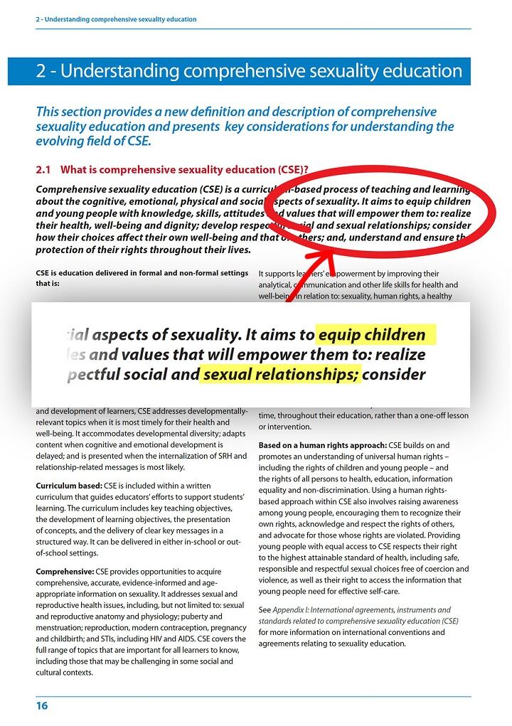 Das von den Vereinten Nationen herausgegebene Dokument „International Technical Guidance on Sex Education“ ist der offizielle Leitfaden für Grundschulen auf der ganzen Welt. Der Zweck dieses Dokuments ist auf Seite 16 beschrieben.