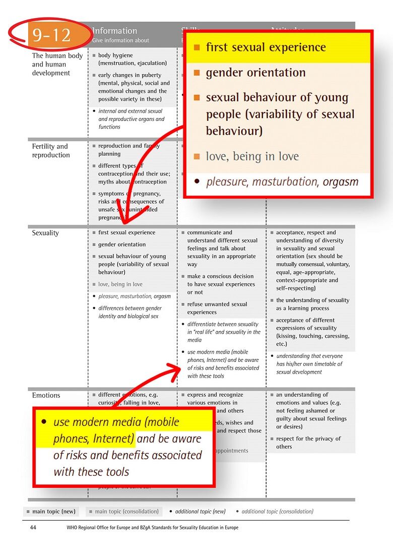 Die Agenda zur Sexualisierung kleiner Kinder wird von der Weltgesundheitsorganisation (WHO) weiterentwickelt. Ihr Dokument „Standards für Sexualerziehung in Europa“ enthält folgende Hinweise für Kindergärten und Grundschulen: