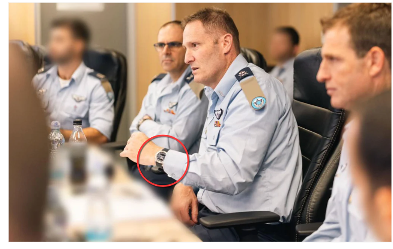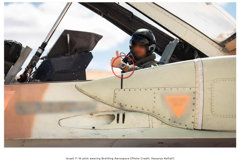 Die 1948 nach Israels Unabhängigkeit gegründete israelische Luftwaffe hat sich zu einer der leistungsfähigsten Luftstreitkräfte der Region entwickelt und setzt dabei auf die Kampfflugzeuge F-15, F-16 und F-35. Das obige Bild zeigt einen israelischen Piloten mit einer möglicherweise von Breitling Aerospace stammenden Einheitsuhr, auf deren Zifferblatt ein Abzeichen und ein Flugzeugrahmen erkennbar sind.